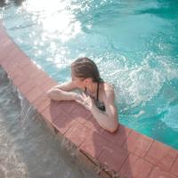 在室外游泳池游泳,热水浸透了来自自然深处的矿物质。