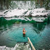 10:00成年礼: 在Katun之眼的冬季湖泊中游泳,岸边的桑拿浴室。
