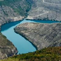 苏拉克峡谷着名的绿丝带蜿蜒在狭窄的悬崖之间,在阳光下闪闪发光,将其水域从Chirkeyskaya水电站大坝运送到Miatlin大坝。