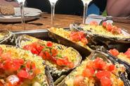 第二门课程 是一个扇贝烤在壳上与磨碎的巴马干酪和费城奶油奶酪。 它在北方浆果上配上强烈的酊剂。